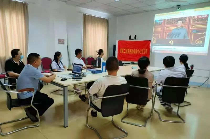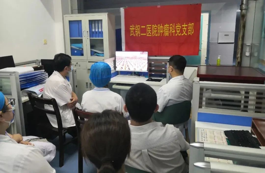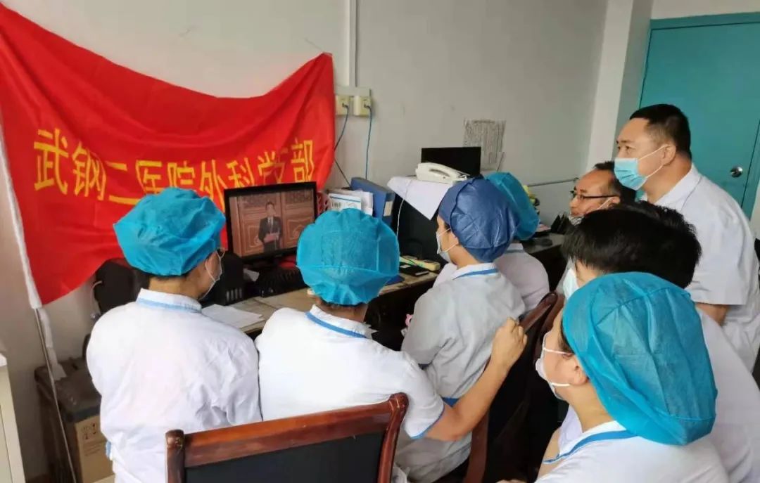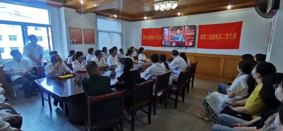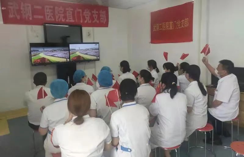 7月1日,中国共产党诞辰100周年纪念日,华润医疗旗下武钢二医院组织广大党员干部和群众,以支部为单位,隆重观看庆祝中国共产党成立一百周年大会。